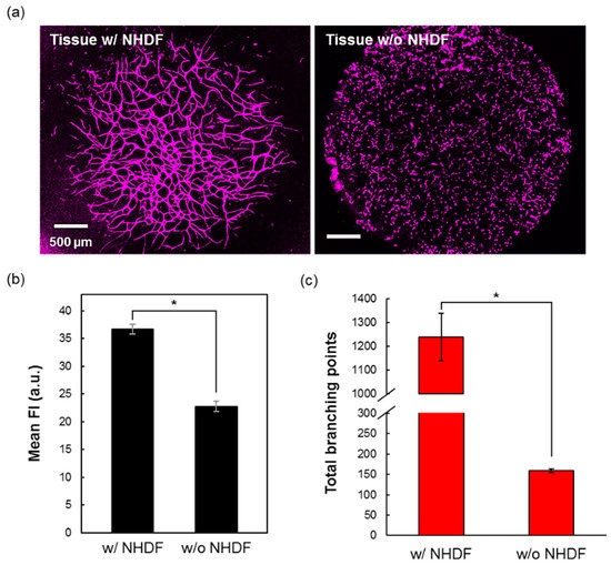 NHDF is the fibroblast cells that generally support the vascular formation. For the next optimization step, we also investigated the necessity of NHDF in coculture with HUVEC in our tissues. The tissue was observed by CLSM and the image of the blood capillaries network were acquired, as shown in Figure 3a. From the image, the importance of NHDF for the vascular formation was clearly highlighted, the tissues without NHDF presenting almost only individual endothelial cells not connected in a vasculature network. The analysis of the mean CD31 fluorescence intensity of the tissue with and without NHDF then confirmed that the tissues with NHDF had higher vascular structures than the tissues without (Figure 3b). This result was supported by the total branching points analysis that also significantly showed a higher branching or networking for the tissues with NHDF compared to tissue without (Figure 3c). From this experiment, we could confirm the already reported important role of the NHDF as supporting cells for vascular formation [29,30].