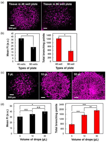 The ability to culture the 3D-blood capillary model was further investigated, in particular, for its use in microarray analysis. In this study, we used 48- and 96-wells plate to serve as medium and high-throughput assays, respectively. The 3D-tissues that were cultured in 48- and 96-wells plate were of the same volume (10 µL drop), but the available well volumes allowed to add more culture medium in the 48-well plate. After five days of culture, the tissues were observed by CLSM, as shown in Figure 4a, leading to 96-wells plate tissues showing a lower vascular formation network as compared to the tissues in the 48-wells plate. This might be due to the insufficient culture medium volume in the 96-wells plate (300 µL of culture medium), compared to the 48-wells plate (1.2 mL of culture medium), and this even when the culture medium in the 96 wells was changed every day. The quantification data confirmed that the mean fluorescence intensity and total branching points of tissues in 48-wells plate were significantly higher than that the 96-wells plate tissues in (Figure 4b).