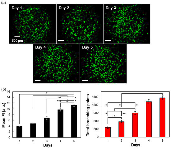 Another step was to monitor the time effect on the vascular network formation during the five days of culture. In this experiment, we used green fluorescent protein labeled the EC (GFP-HUVEC) cells in order to enable visualization of daily formation of vascular networks in live without cell fixation. The confocal images that are shown in Figure 5a highlight the vascular network that started to form from day 3. This phenomenon was supported by quantitative data where the mean fluorescence intensity as wells as total branching points were increasing day by day (Figure 5b). As the time for culturing the tissues was relatively short, this will be an advantage point for preparing the 3D tissues that could be used as microarray analysis and, thus, be a powerful tool for screening assay.