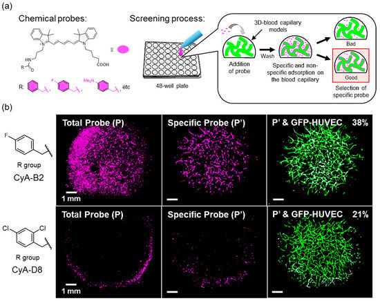 Eighty of near-infrared (NIR) chemical probes with the core structure of cyanine with different substituents (R group) were screened to select the highest specific probe binding to the blood capillaries [27]. The dried probes were dissolved in DMSO in order to have 10 mM of stock solution. For the experiment, the probes were further diluted in DMEM to get a final concentration of 1 µM, including 0.1% of final DMSO concentration, known to be not cytotoxic for the cells. After 20 min of probe incubation at 37 °C, 5% CO2, on the blood capillary models, the tissues were then washed with PBS to remove the unbound probes. Live imaging of probes adsorption was next acquired by confocal laser scanning microscopy (CLSM, CQ1). The images were finally used to analyze the colocalization of the probes to the blood capillaries.