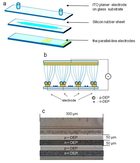 To sort ES-B3 and MEF cells from the mixed cell suspension, the DEP characteristics of ES-B3 and MEF cells were evaluated. To determine the crossover frequency between negative- and positive-DEP, the behavior of each cell was evaluated under various AC voltage frequencies. To cause the DEP phenomenon, a non-equal electric field was generated using transparent conductive glass (Figure 1) [37,39]. This chamber consisted of a transparent parallel-line electrode array on a glass substrate, ITO-coated glass, and a silicone rubber gasket. The parallel-line electrode array was fabricated using ITO-coated glass (Geomatec Co., Ltd., Yokohama, Japan) as a conductive substrate. The thickness of the ITO layer was 1500 Å, and the resistance was 5 Ω/sq. The parallel-line electrode was patterned using laser etching techniques. The electrode array was designed to generate a highly non-uniform electric field [37,39]. The width of each electrode line was 20 μm, and the spaces between each electrode were 80 μm (Figure 1a). The flow channel was made from a silicon rubber gasket to make a rectangular volume. The DEP chamber was formed by sandwiching the silicon rubber gasket between the parallel-line electrode array and a bare ITO-coated slide glass drilled with holes for the fluidic inlet and outlet. The thickness of the silicon rubber gasket was 500 μm. The cells were moved toward the electrodes by p-DEP and between electrodes by n-DEP in the DEP chamber (Figure 1b). The AC electric field was applied between the parallel-line electrode array and bare ITO-coated glass, using a function generator (WF1974, NF Corp., Yokohama, Japan) and amplifier (BA4850, NF Corp., Yokohama, Japan). The applied voltage was monitored by an oscilloscope (TDS1001B, Tektronix, Beaverton, OR, USA) connected in parallel. The movements of the cells within the DEP chamber were observed using a phase-contrast microscope (Nikon Eclipse TE300, Nikon, Tokyo, Japan) with a digital video camera.