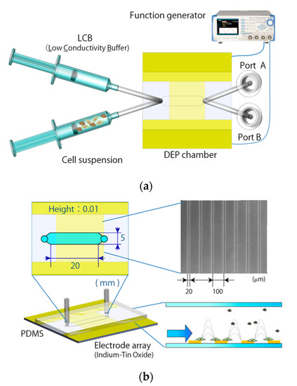 The DEP cell-sorting system consisted of a custom-made syringe pump with a PC control system, two syringes filled with the cell-mixed suspension containing ES-B3 and MEF cells and LCB solution, and the DEP chamber described in Section 2.3 (Figure 2a). The outlet of the DEP chamber was connected to two outlet ports, named port A (waste port) and port B (cell-collector port), through the switching channel. The DEP chamber was also connected to syringes containing cell suspension and LCB solution. The custom syringe pump controlled the flow rate of the cell suspension and LCB solution. The two syringes were connected to each other by a silicone rubber tube (diameter: 1 mm) and introduced into the DEP chamber. The DEP chamber for cell sorting had the same transparent parallel-lined electrode array on the lower surface of the chamber as described in Section 2.3. The flow channel of the DEP cell sorting chamber was made from a polydimethylsiloxane (PDMS) polymer sheet with a molded channel shape (Figure 2b). The DEP chamber was formed by a PDMS sheet sandwiched between the ITO glasses. The flow channel was designed to be 3 mm long from the inlet to the electrode array, 5 mm wide, and 100 μm high. The length of the flow channel was designed to ensure that whole cells were dropped on the electrode array during the cell-sorting procedure [20].