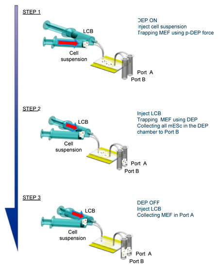 DEP and fluid-flow-based cell sorting was performed as described below (Figure 3). First, the cell-mixed suspension was injected into the chamber at a flow rate of 0.024 mL/min, and an AC electric field was imposed on the electrode array to cause p-DEP in MEF cells and n-DEP or neutral in ES-B3 cells (Step 1). In Step 1, the MEF cells were trapped on the electrodes, while the ES-B3 cells passed through the electrode array and were introduced into port B. After the line-electrode array was almost filled with the MEF cells, the AC voltage was switched off to remove the p-DEP force (Step 2). Next, the bulk LCB buffer was injected at a flow rate of 2.4 mL/min to release the trapped MEF cells from the electrode array, and they were introduced into port A (Step 3). To repeat this sorting procedure from steps 1 to 3, the MEF cells could be continuously eliminated from the ES-B3/MEF cell-mixed suspension.