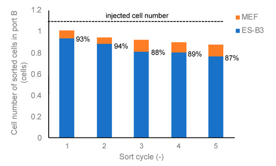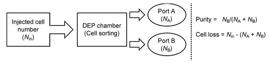 To evaluate the purification efficiency of the DEP cell-sorting system, the number of injected cells (Nin) and those of ports A and B (NA, NB) were counted (Figure 4). The number of injected cells containing both ES-B3 and MEF cells was evaluated in order to compute the average number of cells passing through the first line of the electrode-array for 10 s. The numbers of cells in ports A and B were counted using a hemocytometer. The ES-B3 and MEF cells were distinguished based on the differences in the cell diameter; the diameter of ES-B3 cells ranged from 5–8 μm, and that of MEF cells ranged from 10–20 μm. The purification ratio of DEP cell sorting was determined so as to measure the existing ratio of ES-B3 cells in port B (collecting port). Moreover, the continuity of cell sorting was evaluated so as to measure the purification ratio at multiple cycles of our DEP cell-sorting system.