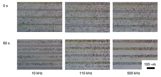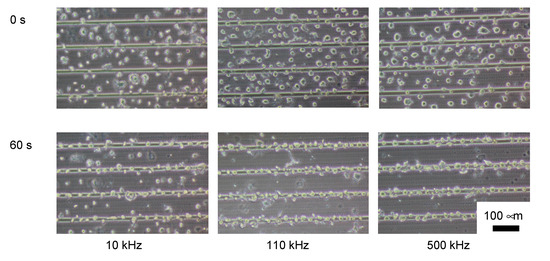 where ε is the relative permittivity of the particle or surrounding medium, σ is the electrical conductivity, and ω is the angular frequency of the applied AC electric field. This equation shows the dependency of the CM factor on not only the electric properties of the particle and surrounding medium but also on the frequency of the applied AC electric field. The frequency where the direction of the DEP force changes from n-DEP to p-DEP is called the crossover frequency. Our previous study reported that living cells and polystyrene beads could be separated based on DEP properties [19]. Therefore, cells could be distinguished based on differences in dielectrophoresis phenomena.