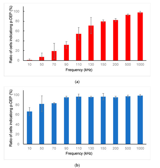 Ratio of (a) ES-B3 and (b) MEF cells indicating positive dielectrophoresis according to the frequencies of the applied AC electric field.