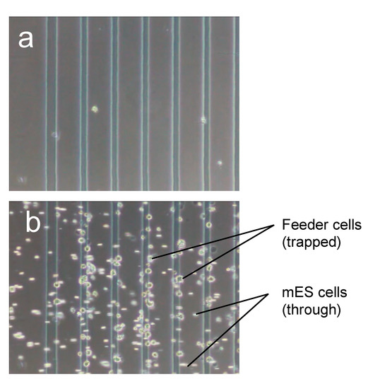 The dielectrophoretic property of living cells depends mainly on the electric property and diameter of the cells [40]. Therefore, it was considered that ES-B3 and MEF cells showed different dielectrophoretic properties because of their difference in cell size and functionality. Based on this difference in the DEP property, the ES-B3 and MEF cells could be distinguished under an AC voltage of 110 kHz, where the DEP force of the ES-B3 cell was negligible and the MEF cells showed a positive DEP and were trapped on the electrode array.
