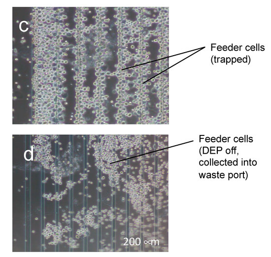 There are superior conventional cell-sorting methods, such as FACS and MACS, for evaluating the cell type or cell function quickly and accurately. Although these methods are effective for cell sorting, the labeling of cells by antibody or fluorescent dye is required [4,5]. Our newly developed DEP cell-sorting system does not require antibodies, fluorescence dyes, magnetic beads, or expensive equipment. In addition, the process of our DEP cell-sorting system was simple when compared to other DEP cell-sorting systems [41,42,43,44,45,46], with no complicated processes and with a high extensibility. Furthermore, our DEP cell-sorting system does not require a numerical analysis of the fluid-flow in the DEP chamber. By using a multiplex DEP-chamber or by extending the width of the chamber, the throughput of the DEP cell-sorting system could be larger. Therefore, our DEP-cell sorting system would be applicable for research and clinical uses requiring a large number of purified cells.