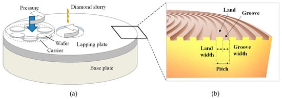 Lapping using microabrasives improves the flatness of the substrate being machined and reduces the thickness of the subsurface damaged layer in the manufacturing of single-crystal substrates such as sapphire, SiC, and GaN, which in turn reduces the post processing time of chemical mechanical polishing (CMP) [1,2,3,4]. Microdiamonds are normally used as the abrasive particles, and metal platens made of cast iron, copper, or tin are used as the lapping platen [5,6,7,8]. In the lapping process, as shown in Figure 1a, the substrate is machined using the relative motion between the substrate and the platen. A pressure load is applied to the substrate while supplying a uniformly dispersed abrasive solution (i.e., a slurry) on the platen surface. The flatness of the platen is adjusted and the grooves on the platen surface are formed using a facing device [9,10].