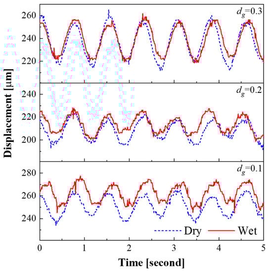 The oil film thickness between the platen and the substrate was measured to confirm the contact interface state change with groove density during lapping process. Figure 4 shows the effect of the groove density on the displacement of the polishing head. When the groove density was 0.10, it showed the largest displacement difference, and as the groove density increased, the displacement difference decreased. In the case when groove density was 0.30, there was almost no displacement difference. When the groove density was 0.10, the average displacements of the head in the dry and wet states were 251 and 262 µm, respectively. The average displacement of the head increased by 11 µm when slurry was supplied on the platen, indicating that an 11 µm thick oil film was formed. In this way, the oil film thickness for all groove density values was measured, as shown in Figure 5.