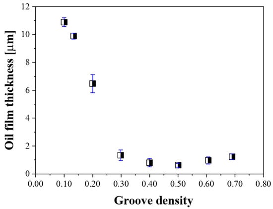 The oil film thickness was highest when the groove density was 0.10 and gradually decreased as the groove density increased. When the groove density was 0.30 or higher, the oil film thickness converged to approximately 1 µm. This indicates that when the groove density was less than 0.30, hydroplaning occurred at the contact interface between the substrate and the platen, resulting in the development of the oil film.