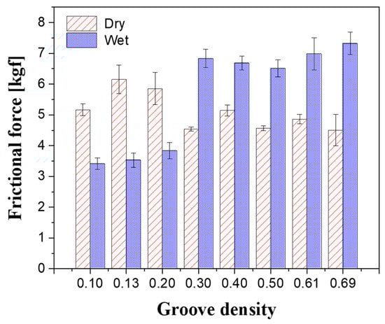 To verify the formation of the oil film, the frictional force generated between the substrate and the platen was measured at each groove density value under the same experimental conditions used for oil film thickness determination; the average values of the measured frictional forces are shown in Figure 6. In the dry state, the friction force decreased with increasing the groove density and tended to converge at a groove density of 0.3 or above. In the wet state, the frictional force increased up to a groove density of 0.3 and showed a convergent tendency. The significant frictional force differences between the dry and wet states indicate that the contact interface condition changed. When the groove density ranged from 0.10 to 0.20, the frictional force in the dry state was greater than that in wet state, i.e., when slurry was supplied between the substrate and the platen, the frictional force decreased. As indicated by the oil film thickness results presented previously, when the groove density was low, the oil film developed and the substrate and the platen were completely separated by the slurry. Conversely, when the groove density ranged from 0.30 to 0.69, the frictional force in the wet state was greater than that in the dry state. This is because the diamond abrasives on the land generated cutting forces while removing the sapphire substrate.
