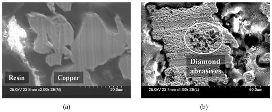 By comparing the changes in oil film thickness and frictional force, when the groove density was less than 0.3, it can be assumed that the contact interface experienced mixed lubrication, in which the pressure load was supported by the abrasive particles and the slurry, and the smaller the groove density, the larger the oil film thickness. When the groove density was 0.3 or higher, boundary lubrication occurred, in which the abrasive particles on the platen surface were in contact with the substrate. In the boundary lubrication region, the load applied to the substrate is supported by the abrasive particles. In addition, some large particles are deeply embedded in the platen or broken when subjected to a force higher than the breaking strength due to the characteristics of the polycrystalline diamond particles [32]. The scanning electron microscope (SEM) image of the land presented in Figure 7a shows that only tool marks are present on the copper surface after the facing process. As shown in Figure 7b, after the lapping process, indentation marks are generated when the abrasive particles are rolled between the substrate and the land or when they are momentarily stuck on the land. In addition, some particles are embedded on the copper surface.