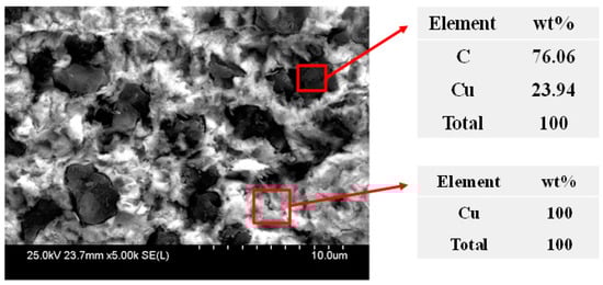 Energy dispersive analysis of X-ray (EDAX) was performed to confirm what the particles on the surface were. The results are shown in Figure 8. It was confirmed that the particles are mostly composed of carbon and are diamond abrasives. Owing to the diamond abrasive particles embedded on the land, the measured oil film thickness was approximately 1 µm, even when the groove density was 0.3 or higher. From these results, we can conclude that, depending on the groove density, a change in the oil film thickness at the contact interface may occur, which may affect the lapping process characteristics.