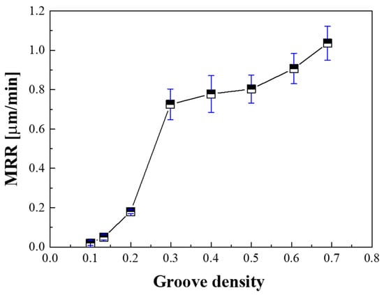 To confirm the effect of the oil film thickness change on the lapping process characteristics, lapping experiments were performed for each groove density. The MRR was calculated by dividing the processing time by the amount of removed material; the results obtained are shown in Figure 9. The MRR presented its lowest value at a groove density of 0.1, increased rapidly at a groove density of 0.3, and gradually increased at groove densities above 0.3. This is because when the groove density is 0.3 or less, the load pressing the substrate is mostly supported by the slurry, in a mixed lubrication state. In addition, since the average size of the diamond abrasive particles used for lapping (3.1 µm) was lower than the oil film thickness, they could not participate in the lapping process. Consequently, as the groove density decreased, the MRR decreased rapidly.