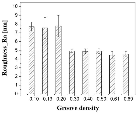 Figure 10 presents the average value of the surface roughness measured at 21 points after lapping at each groove density. When the groove density was smaller than 0.30, at which the oil film was thick, the surface roughness (Ra) was approximately 7.5 nm; when the groove density was 0.30 or higher, the surface roughness rapidly decreased to less than 5.0 nm. The particles in the diamond abrasive had an average size of 3.1 μm; however, their size was normally distributed, ranging from 1 to 5 μm. In the case of low groove densities (0.10–0.20), most of the abrasive particles could not participate in the lapping process because the oil film thickness between the substrate and the platen was greater than the abrasive particle size. As only large abrasive particles could be in contact with the substrate, some of them created deep and wide scratches on the substrate surface. In addition, when the oil film thickness changed owing to the runout of the platen, some particles came in contact with the substrate under a high load, resulting in a low MRR and a high surface roughness.
