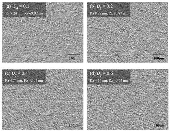 This can be confirmed through the differential interference contrast images of the substrate surface presented in Figure 11; in these images, scratches are shaded and darkened as their depths increase. In Figure 11a,b, as the groove density was low, many deep and wide scratches are distributed on the substrate surface. For groove densities greater than 0.30, shallow, narrow, and fine scratches are densely distributed on the substrate surface, as shown in Figure 11c,d.