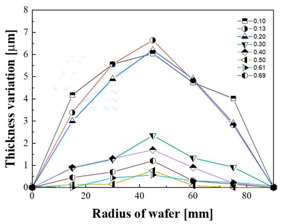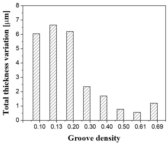 The change in the film thickness caused by groove density variation also affected the flatness (i.e., the TTV) of the substrate after lapping. As shown in Figure 12, when the groove density was less than 0.30, the TTV of the substrate was approximately 6 μm; conversely, when the groove density was greater than 0.30, it presented small values (from 1 to 2 μm). In the lapping process, the flatness of the substrate is mainly determined by the shape of the platen [33,34,35]. In this study, the shape of the platen was machined equally at all groove densities via a facing process. However, as shown in Figure 13, the flatness of the substrate presented different characteristics depending on the groove density. When the groove density was less than 0.30, the shape of the substrate was convex, with the largest thickness deviation located at the center of the substrate. The edge effect that the edge thickness of the substrate becomes thinner is a very important factor because it is related to the yield in the semiconductor manufacturing process [36]. When the groove density is less than 0.30, the edge effect occurs and the flatness of the substrate is deteriorated.