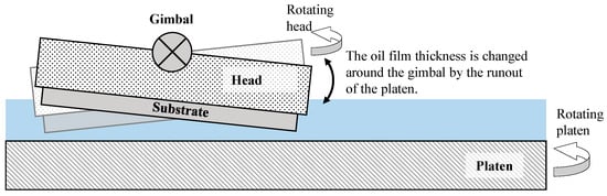 Thakurta [37] presented the contact interface between the substrate and the pad as a solid-fluid-solid contact in the CMP process. This study confirms that since the head has a gimbal structure, the moment due to frictional force is unstable, which can lead to hydrodynamic lubrication and mixed lubrication at the same time. This phenomenon may occur because the lapping head used in this experiment also has a gimbal structure. The removal amount at the edge of the substrate increased as the oil film thickness changed around the head gimbal owing to the runout of the platen, as shown in Figure 14. If the groove density is greater than 0.30, this phenomenon does not occur because the platen and the substrate are attached to each other in the boundary lubrication state.