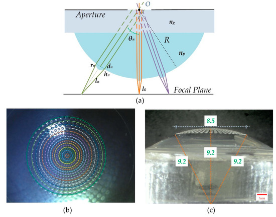 As shown in Figure 1a, multifocal compound eyes located on a planoconvex substrate were designed. O is the optical center of the compound eyes, and the optical ray of each cycle of the MLA passes through the point of O due to the aperture stopping. The microlens on the surface apex as the center is denoted as the 0th cycle, and the MLAs extended outward with the circumference are named the 1st, 2nd, nth cycles in turn. The microlenses in each annulus cycle possess the same parameters. The distance of the nth microlens along the optical axis between the image plane is . In the arrangement of gradually increased cycles from 0th to 16th, the focal length of every microlens array must be resized following , so that the images formed by different arrays can fall on the same planar detector. We set the vertical distance between the 0th cycle microlens and the image sensor plane as , which is equal to the focal length of the 0th microlens. In particular, the refractive index of substrate holding up the compound eyes is recorded as , but is not limited to glass. In this simulation model, the small eye is treated as a thin lens, and according to the thin lens equation and geometrical relationships, three equations can be deduced: