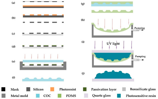 - Cherng, Y.-S.; Su, G.-D.J. Fabrication of polydimethylsiloxane microlens array on spherical surface using multi-replication process. J. Micromech. Microeng. 2014, 24. [Google Scholar] [CrossRef]