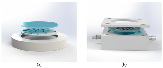 Three-dimensional diagram of the home-built metal mold structure: (a) grooved tray for relieving excess pressure in the hot embossing process; (b) sealed cavity for package of the PDMS intermediate die with MLA structure.
