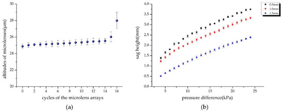 As shown in Figure 5a, there was good uniformity in the altitudes of the microlenses from the 0th to 14th cycles, but the deviation started to increase from the 15th, which was affected by the filling efficiency. Since the fill factor of the micropores decreased sharply from the 15th cycle, the polymer was more sufficiently filled, so the altitudes of the microlens arrays in the 15th and 16th cycles were larger than the inner ones. Despite the 16th cycle, the altitudes of the polymer MLAs did not change much with the increasing diameters from the 0th to 15th cycles, and the deviation was less than 6%. Figure 5b illustrates that under the same pressure, the smaller the membrane thickness, the greater the sag depression, that is, the more sensitive the response to pressure changes. Our previous studies showed that the elastic deformation of PDMS membrane is linear to the pressure difference in a certain range [39], and Figure 5b shows that there was a wider range of linear deformation and relative morphological stability when the thickness was 1.0 mm. We finally set the membrane thickness as 1.0 mm. The diameters of MLAs in different cycles based on the polymer and PDMS were also observed by an ultra-depth-of-field microscope (KEYENCE, VHX-1000, Osaka, Japan), and the maximum standard deviation was from the MLAs with PDMS. The diameter reduction was about 3% compared to the ideal results, mainly due to shrinkage after PDMS curing and demolding. The results showed relatively high uniformity and accuracy of geometry in the process of deformation.