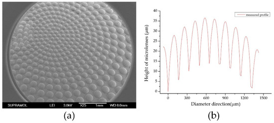 In particularly, it must be mentioned that the interferometric technique is the most popular and accurate method to assess the presence and the amount of aberrations in an optical system, and the interference microscopy testing allow to perform the full characterization of each kind of microlenses as an accurate procedure [40,41]. Herein, because of the range limitation of our measuring tools, a probe profiler (Veeco, Dektak150, New York, NY, USA) and a scanning electron microscope (SEM; JEOL, JSM-6700F, Tokyo, Japan) were applied to characterize the 3D surface profile of the planoconvex compound eye and microlenses. As shown in Figure 6, the diameter and height of the microlenses on the center areas are approximately 150 μm and 25 μm.