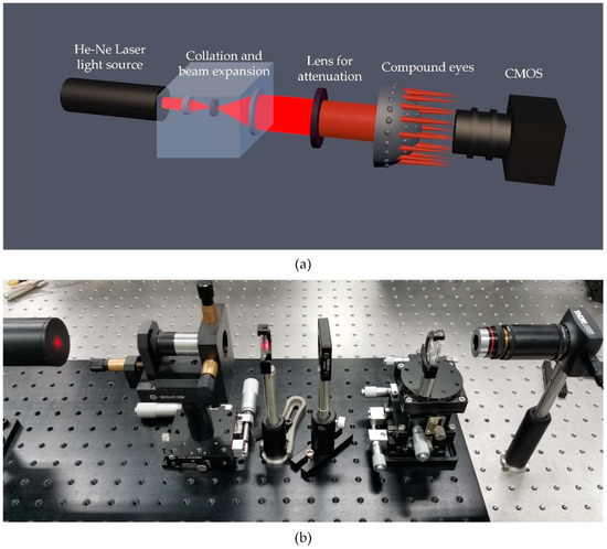Experimental installation for optical performance: (a) schematic diagram of the setup; (b) actual platform comprised of He-Ne laser source, microscopic objective lens, pin hole, convex lens, MLAs, optical density filters, microscopic objective lens, and photodetector.