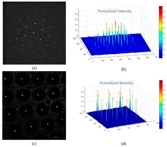 Focal spots of compound eyes with single and multiple focal lengths: (a) focal spots of single focal length microlenses on dome area; (b) normalized intensity distribution of single focal length microlenses; (c) focal spots of multiple focal length microlenses on the middle area; (d) normalized intensity distribution of multiple focal length microlenses.
