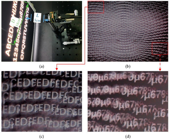 Experiment of field of view (FOV) testing: (a) experimental setup of the testing system; (b) numbers and letters captured by multifocal compound eyes; (c) close look at the upper-left portion of the image; (d) close look at the lower-right portion of the image.