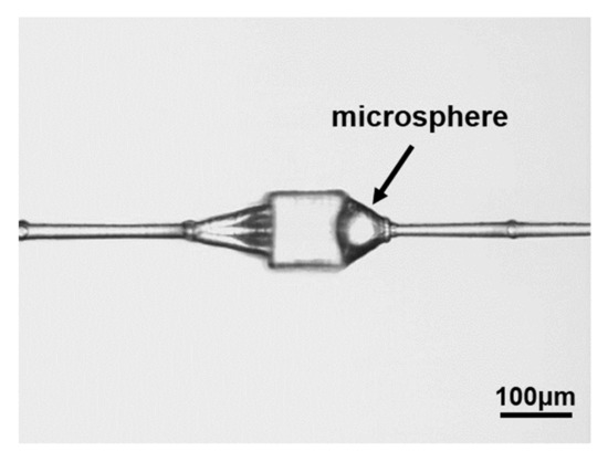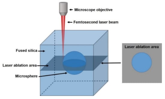 The three-dimensional (3D) spherical structure nested in the internal microcavity of fused silica has wide applications. Many novel micro-nano devices have been fabricated with this structure [,,]. For example, the nested microsphere can be fabricated into a movable plug to realize a microsyringe, which can precisely control the amount of liquid injected. The microsyringe can be widely used in biomedicine. The 3D structure can also be fabricated into microsensors, such as microgyroscopes and microaccelerometers, by some fabrication methods []. It can be well integrated into microfluidic systems to improve the miniaturization and integration performance of microfluidic chips and can be applied in the field of microsatellites or biochips.