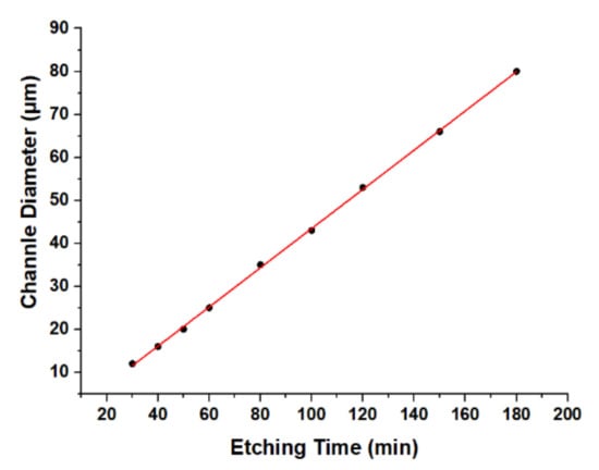 The results show that the channel diameter increased linearly with the etching time during the process. The sample was periodically removed from the corrosion solution. Therefore, the size of the microcavity and microsphere structure could be controlled by controlling the etching time.