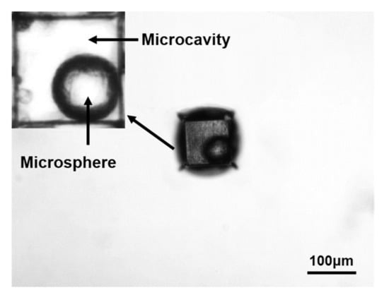 Using the above experimental method, we first fabricate the nested structure of the microcavity with the microsphere inside the fused silica, as shown in Figure 3 taken by a light microscope, where the diameter of the microsphere was 60 μm and the side length of the microcavity was 100 μm × 100 μm × 100 μm.