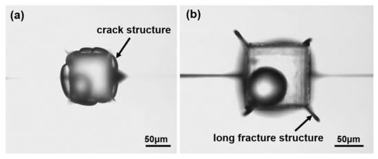 So, when the femtosecond laser scans in a tiny area, it deposits a huge amount of energy inside the fused silica and creates huge internal pressure. The thermal shock wave and pressure shock wave effect and modify the unprocessed materials around the micro-cavity, and change the structure of the surrounding materials and generate internal stress. When the femtosecond laser modification process is completed, the internal stress and the damaged structure around the fused silica inner microcavity do not disappear but continue to remain inside. After wet etching with the hydrofluoric acid solution, the unablated area around the microcavity was easily corroded by hydrofluoric acid due to internal stress and structural modification. Finally, a crack structure with random shape appeared, as shown in Figure 4a.