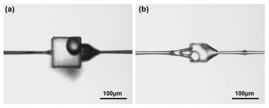 By adopting the improved processing method, we prepared two microdevices of microcavity with microsphere structure by using the processing parameters of 2 mW laser power and 600 μm/s laser scanning speed and combined with the modified processing control program, as shown in Figure 5. These images are a focal plane image of different samples under a light microscope. The laser power density is reduced from 4 mJ/cm2 to 0.33 mJ/cm2. As shown in Figure 5a, a micro-cavity device composed of a cylinder and a cone was added at the right end. Figure 5b adds a conical structure on the right side of the microcavity and on the left side adopts two simple microdevices connected by an excessive channel at a certain angle. It can be seen from the processing results that there is basically no crack around the microcavity in these two kinds of microdevices.