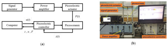 As is shown in Figure 1b, the voltage signal generated by the signal generator (33500B, Keysight, CA, USA), amplified by the power amplifier (E00. A4, Core Tomorrow, Harbin, China), was applied to the piezoelectric actuator (Pst150/7/20 VS12, Core Tomorrow, Harbin, China). The piezoelectric actuator provided the piezoceramic (P-841.6, Physik Instrumente, Karlsruhe, Germany) with a dynamic force, which could be calculated by the following formula: