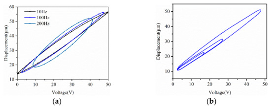 Two groups of experiments (Case 1: u (t) = Asin2πf), F (t) = 0; Case 2: u (t) = Asin2πf, F (t) = Bsin2πf) were carried out on the platform to validate the dynamic characteristics of piezoceramics. Figure 4a shows the relationship between the exciting voltage (f = 10 Hz, 100 Hz, 200 Hz) and the displacement. Figure 4b is the multi-hysteresis loops under voltage input u (t) = 50sin10πt, t ϵ [0,0.1]; u (t) = 30sin [10π (t-0.1)], t ϵ [0.1,0.2] and u (t) = 20sin [1 0π (t-0.2)], t ϵ [0.2,0.3].