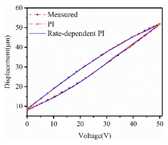 Hysteresis curve measured and hysteresis modeling based on classic a Prandtl–Ishlinskii (PI) method and a rate-dependent PI model.