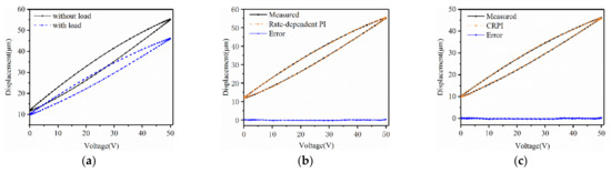 (a) Measured displacement with and without load; (b) Predicted and measured displacements of rate-dependent PI and errors; (c) Predicted and measured displacements of the cross-coupling rate-dependent Prandtl–Ishlinskii (CRPI) method and errors.