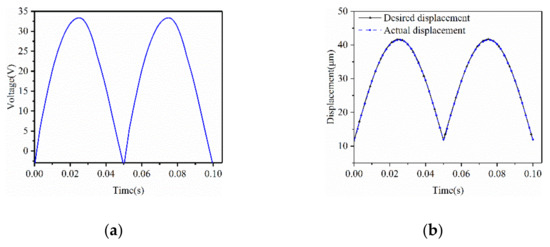 (a) The exciting u (t) after compensation of the rate-dependent PI model; (b) Actual displacements after compensation and desired displacements.