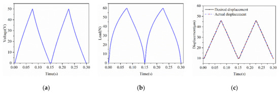 As for the desired displacements z (t) = 480 t + 10, t ϵ [0,0.075]; z (t) = 480 t + 82, t ϵ [0.075,0.15] of the PEA under both voltage and load excitation, the compensated voltage and the compensated load are shown in Figure 8a,b, respectively. The required displacements and the measured displacements after compensation are shown in Figure 8c. The maximum error and average error are 0.5284 μm and 0.1527 μm, respectively. When there is no inverse feedforward compensator applied, the maximum error and average error can be 3.4861 μm and 1.7485 μm, respectively. The hysteresis effect is reduced by about 91% and this proves that the feedforward control method proposed is significantly effective in compensating the hysteresis characteristic.