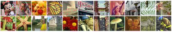 The 22 color images used in our experiments. Top row, from left to right: Mickey, Barbara, Bear, Butterfly, Fence, Haight, Lake, Lena, Light, Leaves, Lily. Bottom row, from left to right: Pepper, Starfish, Man, Tower, Flowers, Nanna, Corn, Agaric, Monk, Zebra, Fireman.