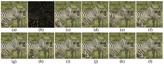Visual comparison of Zebra by image inpainting with 80% missing pixels. (a) Original image; (b) Degraded image with 80% pixels missing; (c) BPFA [] (PSNR = 20.90 dB, SSIM = 0.7160); (d) IPPO [] (PSNR = 22.71 dB, SSIM = 0.7744); (e) ISD-SB [] (PSNR = 18.41 dB, SSIM = 0.5899); (f) JSM [] (PSNR = 21.88 dB, SSIM = 0.7556); (g) Aloha [] (PSNR = 22.72 dB, SSIM = 0.7720); (h) NGS [] (PSNR = 20.49 dB, SSIM = 0.7132); (i) BKSVD [] (PSNR = 19.37 dB, SSIM = 0.6912); (j) WNNM [] (PSNR = 22.67 dB, SSIM = 0.7958); (k) TSLRA [] (PSNR = 22.37 dB, SSIM = 0.7572); (l) SPG-SC (PSNR = 23.06 dB, SSIM = 0.7966).