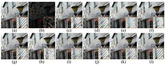 Visual comparison of Light by image inpainting with 80% missing pixels. (a) Original image; (b) Degraded image with 80% pixels missing; (c) BPFA [] (PSNR = 19.26 dB, SSIM = 0.6285); (d) IPPO [] (PSNR = 21.49 dB, SSIM = 0.7827); (e) ISD-SB [] (PSNR = 17.48 dB, SSIM = 0.4902); (f) JSM [] (PSNR = 20.23 dB, SSIM = 0.7254); (g) Aloha [] (PSNR = 21.50 dB, SSIM = 0.7734); (h) NGS [] (PSNR = 18.52 dB, SSIM = 0.6041); (i) BKSVD [] (PSNR = 18.77 dB, SSIM = 0.5792); (j) WNNM [] (PSNR = 22.09 dB, SSIM = 0.8236); (k) TSLRA [] (PSNR = 21.73 dB, SSIM = 0.7780); (l) SPG-SC (PSNR = 22.43 dB, SSIM = 0.8318).