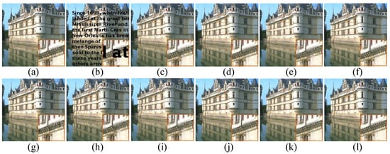 Visual comparison of Tower by image inpainting with text inlayed. (a) Original image; (b) Degraded image with 80% pixels missing; (c) BPFA [] (PSNR = 30.94 dB, SSIM = 0.9530); (d) IPPO [] (PSNR = 31.91 dB, SSIM = 0.9685); (e) ISD-SB [] (PSNR = 28.81 dB, SSIM = 0.9345); (f) JSM [] (PSNR = 32.48 dB, SSIM = 0.9696); (g) Aloha [] (PSNR = 30.34 dB, SSIM = 0.9550); (h) NGS [] (PSNR = 30.21 dB, SSIM = 0.9465); (i) BKSVD [] (PSNR = 30.35 dB, SSIM = 0.9413); (j) WNNM [] (PSNR = 32.70 dB, SSIM = 0.9727); (k) TSLRA [] (PSNR = 31.43 dB, SSIM = 0.9633); (l) SPG-SC (PSNR = 33.23 dB, SSIM = 0.9728).