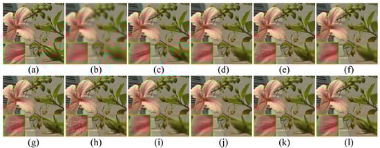 Visual comparison of Lily by image deblurring with uniform kernel. (a) Original image; (b) noisy and blurred image ( uniform kernel, ); (c) BM3D [] (PSNR = 28.58 dB, SSIM = 0.8119); (d) L0-ABS [] (PSNR = 28.05 dB, SSIM = 0.8004); (e) ASDS [] (PSNR = 29.21 dB, SSIM = 0.8290); (f) EPLL [] (PSNR = 27.04 dB, SSIM = 0.7981); (g) NCSR [] (PSNR = 29.39 dB, SSIM = 0.8393); (h) JSM [] (PSNR = 26.97 dB, SSIM = 0.6924); (i) L2-r-L0 [] (PSNR = 28.47 dB, SSIM = 0.8155); (j) WNNM [] (PSNR = 29.25 dB, SSIM = 0.8406); (k) NLNCDR [] (PSNR = 28.69 dB, SSIM = 0.8039); (l) SPG-SC (PSNR = 29.40 dB, SSIM = 0.8476).