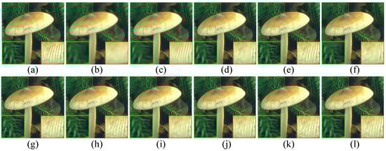 Visual comparison of Agaric by image deblurring with Gaussian kernel. (a) Original image; (b) noisy and blurred image (fspecial(‘gaussian’, 25, 1.6), ); (c) BM3D [] (PSNR = 30.34 dB, SSIM = 0.8368); (d) L0-ABS [] (PSNR = 30.07 dB, SSIM = 0.8392); (e) ASDS [] (PSNR = 30.06 dB, SSIM = 0.8113); (f) EPLL [] (PSNR = 27.69 dB, SSIM = 0.8118); (g) NCSR [] (PSNR = 30.56 dB, SSIM = 0.8466); (h) JSM [] (PSNR = 29.96 dB, SSIM = 0.8087); (i) L2-r-L0 [] (PSNR = 30.30 dB, SSIM = 0.8458); (j) WNNM [] (PSNR = 30.68 dB, SSIM = 0.8570); (k) NLNCDR [] (PSNR = 29.92 dB, SSIM = 0.8081); (l) SPG-SC (PSNR = 30.84 dB, SSIM = 0.8603).