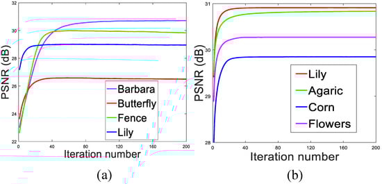 Since the objective function of Equation (13), comprising two norms, is non-convex, it is quite difficult to provide its theoretical proof for global convergence. In this subsection, we give empirical evidence to illustrate the convergence of our proposed SPG-SC algorithm. Concretely, the convergence of the proposed SPG-SC algorithm is shown in Figure 7, where Figure 7a plots the evolutions of PSNR values versus the iteration numbers for image inpainting with 80% pixels missing (including image Barbara, Butterfly, Fence and Lily), and Figure 7b plots the evolutions of PSNR values versus the iteration numbers for image deblurring with Gaussian kernel (including image Lily, Agaric, Corn and Flowers). We can clearly see that with the growth of iteration numbers, the PSNR curves of the recovered images monotonically increase and ultimately become flat and stable. Thus, we conclude that the proposed SPG-SC algorithm exhibits a good convergence performance.