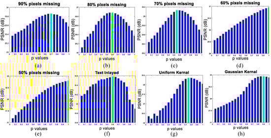 In this subsection, we present how to obtain the best performance of our proposed SPG-SC-based image restoration algorithm through selecting the suitable power p value. To show the influence of the power p value introduced by the proposed dual-weighted minimization, we randomly choose 20 images (size: ) from the Berkeley Segmentation Dataset 200 (BSD200) [] as test images and conduct our proposed algorithm with different p values to image restoration tasks including image inpainting and image deblurring. The average PSNR results under different power p values from 0.05 to 1 with interval 0.05 are shown in Figure 8. It can be found from Figure 8a to Figure 8f that the best PSNR results of image inpainting for our proposed algorithm is achieved by selecting p = 0.70, 0.60, 0.55, 1, 1 and 0.60 when 90%, 80%, 70%, 60%, 50% pixels missing and text inlayed, respectively. From Figure 8g to Figure 8h, we can observe that the best reconstructed performance of image deblurring is obtained by choosing p = 0.75 and 0.90 for uniform kernel and Gaussian kernel, respectively. Therefore, in image inpainting, we choose p = 0.70, 0.60, 0.55, 1, 1 and 0.60 for 90%, 80%, 70%, 60%, 50% pixels missing and text inlayed, respectively. In image deblurring, we choose p = 0.75 and 0.90 for uniform kernel and Gaussian kernel, respectively.